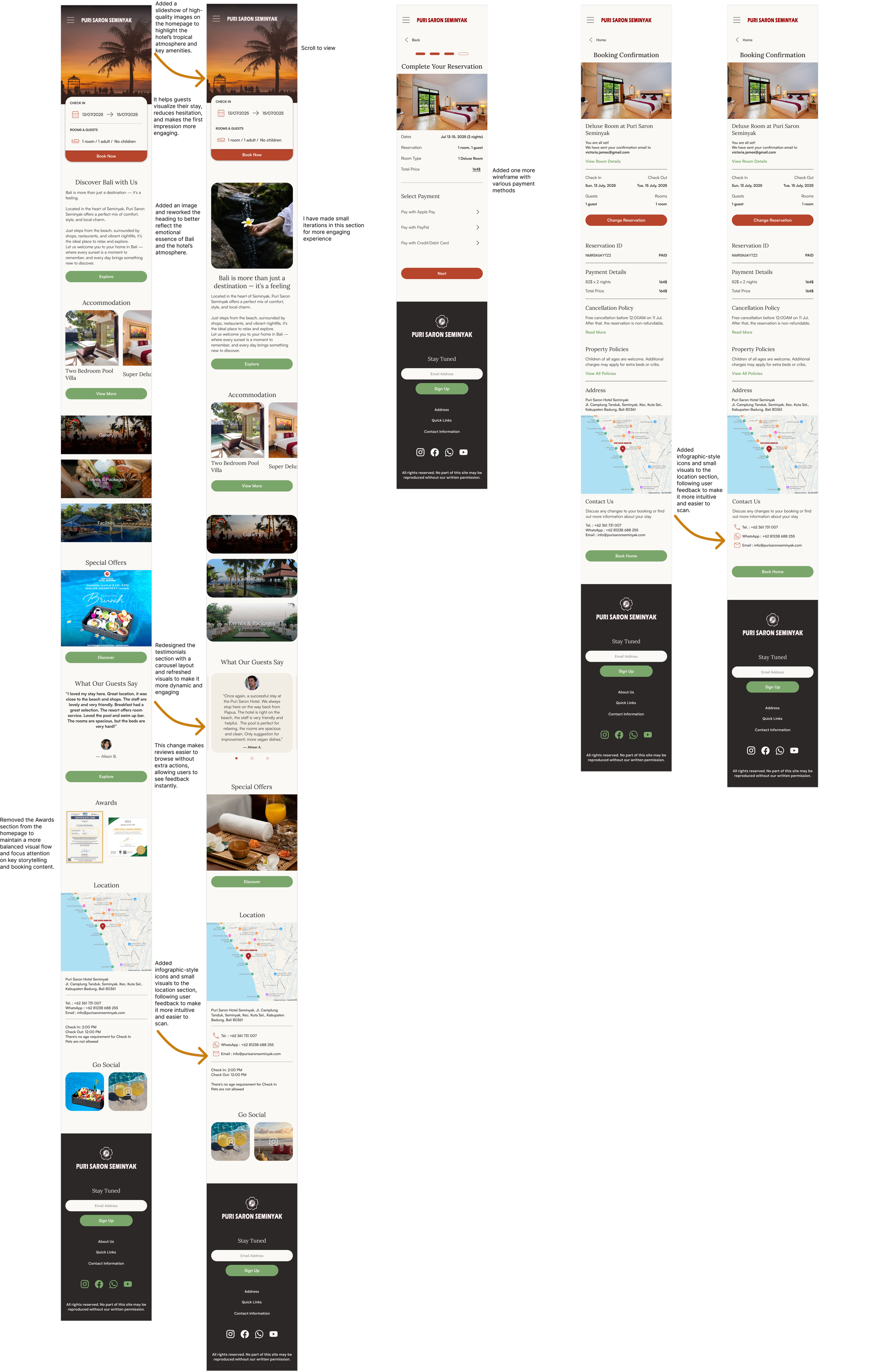 I built high-fidelity wireframes that combine modern structure, warm visuals, and an intuitive booking flow inspired by Puri Saron’s relaxed tropical experience.